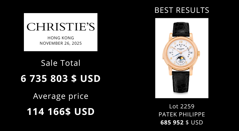 La vente aux enchères « The John Shaw Patek Philippe Collection » organisée par Christies à Hong Kong le November 26, 2025, présentait une sélection exclusive de 59 pièces des meilleures marques horlogères choisies pour leur état, leur rareté et leur qualité. Total de la vente, frais compris: 6 735 803$ USD, soit 100% des lots présentés.
