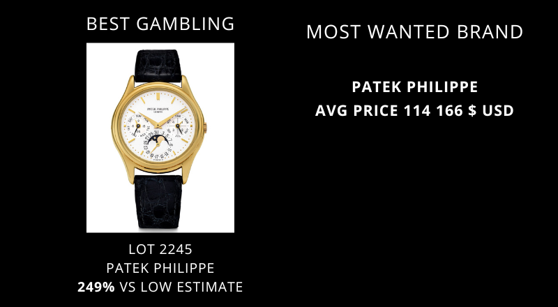 lot 2245: Patek Philippe vers 1989 – an extremely rare 18k gold automatic perpetual calendar wristwatch with moon phases, 24-hour and leap year indication 249% de variation entre l’estimation base et le résultat final (89 827$ usd)