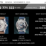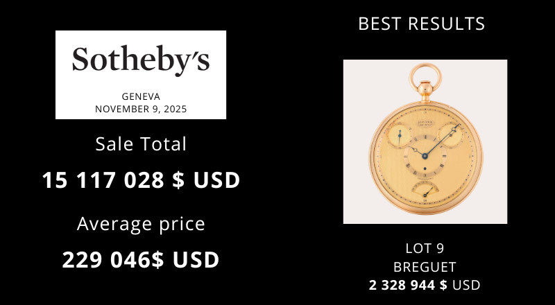 La vente aux enchères « A Celebration of Breguet’s 250th Anniversary » organisée par Sotheby’s à Geneva le November 09, 2025, présentait une sélection exclusive de 70 pièces des meilleures marques horlogères choisies pour leur état, leur rareté et leur qualité. Total de la vente, frais compris: 15117028$ USD, soit 94% des lots présentés.