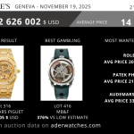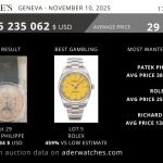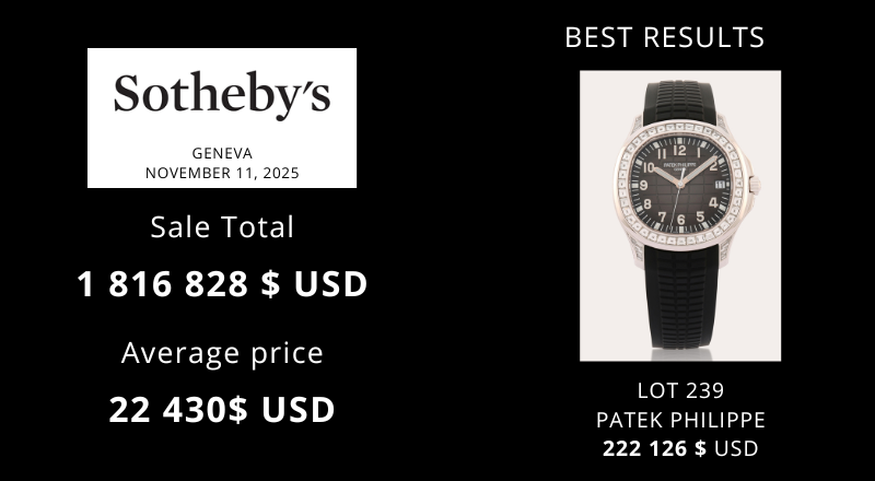 La vente aux enchères « Fine watches » organisée par Sotheby’s à Geneva le November 11, 2025, présentait une sélection exclusive de 88 pièces des meilleures marques horlogères choisies pour leur état, leur rareté et leur qualité. Total de la vente, frais compris: 1816828$ USD, soit 92% des lots présentés.