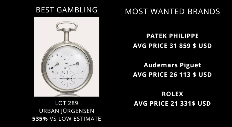 Cette vente a démontré une fois de plus le dynamisme du marché des ventes aux enchères, on peut noter la présence dans le trio de tête des marques suivantes: Patek Philippe, Rolex et Audemars Piguet.